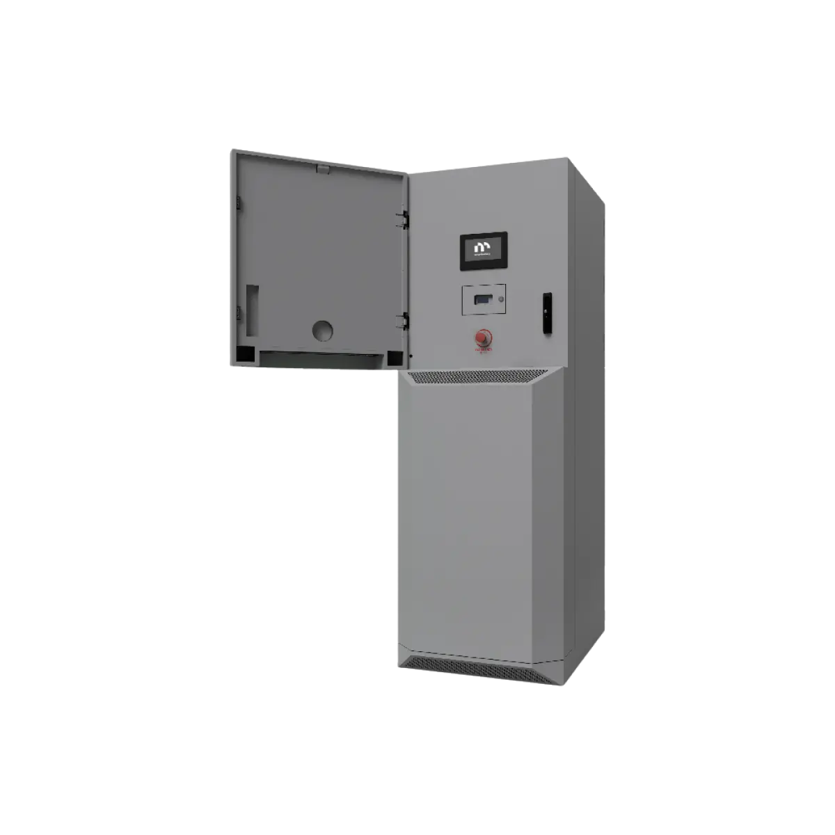 De Vault30 is een geavanceerd energieopslagsysteem voor zowel binnen- als buitenopstelling. Het systeem combineert tot 30 kWh batterijcapaciteit met een geïntegreerde 12 kW hybride inverter en beschikt over actieve koeling via een airco-unit voor optimale temperatuurregeling. Uitgerust met VOC-sensoren en een interne aerosol-blusunit voldoet de Vault30 aan de hoogste veiligheidsnormen. Het interne besturingssysteem biedt potentiaalvrije contacten voor koppeling met externe alarmsystemen en is voorzien van een noodstopknop op de kast en als externe aansluiting voor volledige systeemuitschakeling.